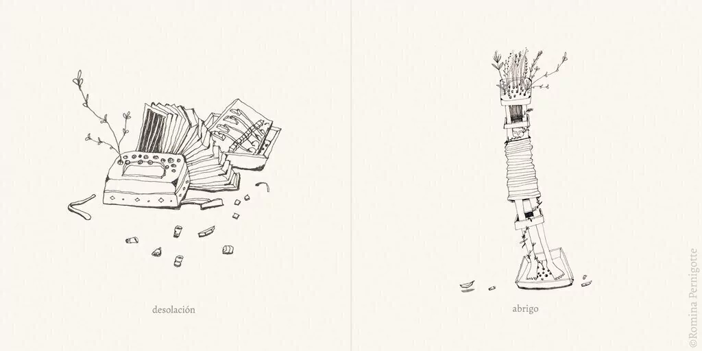 Se trata de un proyecto autogestivo, que nació a partir de la tesis para la licenciatura en artes visuales “Recorridos urbanos”. Los dibujos fueron creados durante 2017/ 2018 en cuaderno borrador. Realizados con microfibra e inspirados en la observación de instrumentos musicales, abrazos de tango y una frase de Dostoyevski. El libro rescata los dibujos del block y la idea, en blanco y negro, de los opuestos que se complementan.